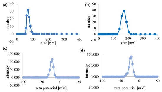 The zeta potential was measured up to 1 week after the synthesis, in water at 25 °C, using a Zetasizer analyser (Malvern Zetasizer Nano ZS, Malvern, UK). The analysis was made using the Malvern Instruments software. The samples were prepared to correspond with the particle size measurement. Malvern cuvettes (DTS1070, Malvern Panalytical, Malvern, UK) were applied to take measures. Each measurement was performed three times. Each value was the average of all measurements.