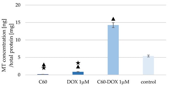 Figure 3. MT concentration in MCF-10A cells treated with C60, DOX and C60–DOX complex. The triangle marks a statistically significant difference compared with the control (p < 0.05). The asterisk marks statistically significant difference compared with the C60–DOX (p < 0.05).