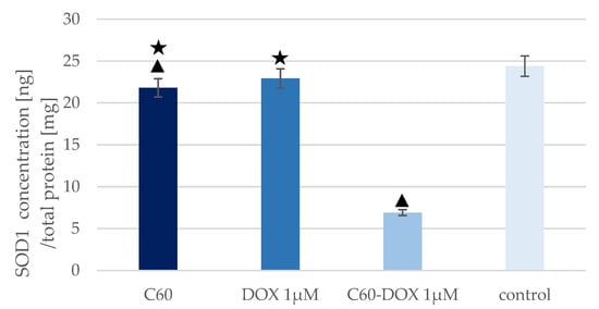 Figure 4. SOD1 levels in MCF-10A cells treated with C60, DOX and C60–DOX complexes. The triangle marks a statistically significant difference compared with the control (p < 0.05). The asterisk marks statistically significant differences compared with the C60–DOX (p < 0.05).