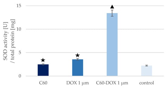 Figure 5. SOD activity in MCF-10A cells treated with C60, DOX and C60–DOX complexes. The triangle marks a statistically significant difference compared with the control (p < 0.05). The asterisk marks a statistically significant difference compared with the C60–DOX (p < 0.05).