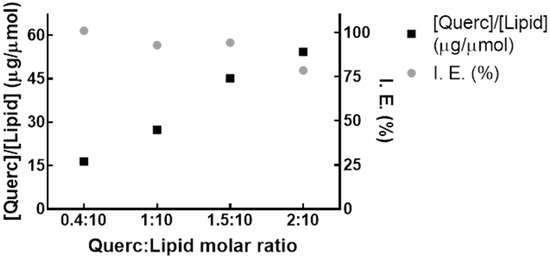 | Nomenclature | Lipid Composition (Molar Ratio) | ([Quer]/[Lipid]) f (µg/µmol) | I.E. (%) | Mean Size (µm) (PdI) | ζ at pH 6.0 (mV) |
