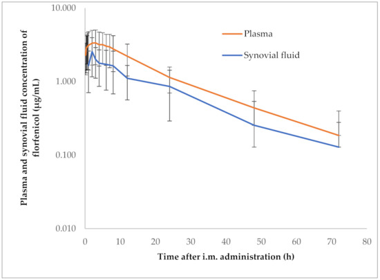 Semi-logarithmic graph illustrating the time-concentration curve of florfenicol in plasma and synovial samples of pigs after a single intramuscular administration of 15 mg/kgbw (n = 6).