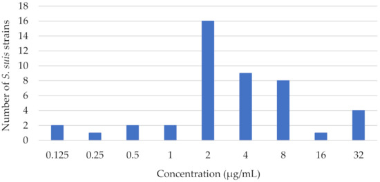 The minimum inhibitory concentrations of 45 isolated S. suis ranged from 0.125 to 32 µg/mL. The distribution of florfenicol MICs against isolates of S. suis is shown in Figure 2. The MIC50 value was 2 µg/mL; florfenicol at this concentration was able to inhibit the growth of 23 of 45 isolates. The MIC90 value was 16 µg/mL; florfenicol at this concentration was able to inhibit the growth of 41 of 45 isolates.