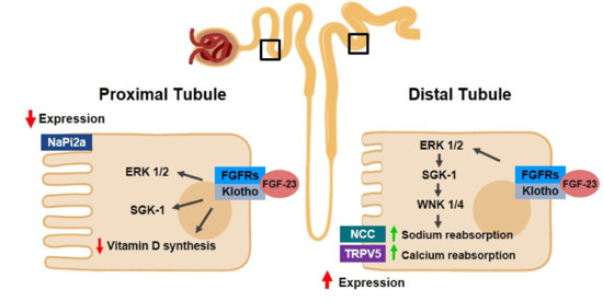 Concerning other minerals, some studies propose that, in distal tubules, Klotho/FGF-23 complexes are responsible for the modulation of calcium and sodium reabsorption, through the activation of ERK1/2, SGK1 and with-no-lysine kinase 4 (WNK4) signaling cascades. These results show that, in the context of low levels of Klotho, FGF-23 might be one of the explanations for CVD risks in patients with CKD [7].