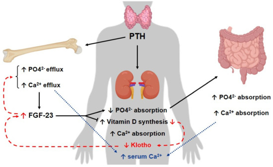 Klotho/FGF and PTH axis in CKD. In kidneys, parathyroid hormone (PTH) leads to an increase in calcium (Ca2+) absorption and Vitamin D synthesis, whereas it diminishes phosphorus absorption. On the other hand, PTH stimulates both phosphorus and calcium efflux in bones. In turn, PTH-stimulated Vitamin D production increases the gastrointestinal reabsorption of these minerals. As a result, both gastrointestinal calcium reabsorption and its efflux from bones contribute to a rise in calcium excretion. Phosphorus (PO42−) is also eliminated as a consequence. In chronic kidney disease (CKD) (red dotted line), there is a reduction in Klotho expression, alongside a decrease in Vitamin D levels and an increase in fibroblast growth factor (FGF-)23 levels. It is important to mention that the decrease of Vitamin D is related to the decrease of Klotho in the kidneys, which then leads to a rise in FGF-23 levels in the bones. As a consequence, this hormone diminishes Vitamin D production. As a result of this axis dysregulation, the inhibition of PTH synthesis promoted by these components is lost, which leads to a rise in the levels of this hormone, which also contributes to the elevation of these molecules. Secondary hyperparathyroidism associated with CKD might be a result of the described imbalance in this axis for CKD patients.