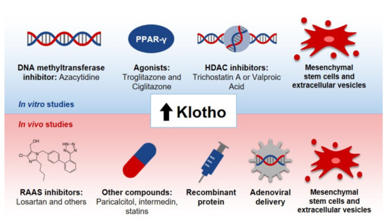 Given the importance of Klotho and its deficiency in both CKD and AKI, some studies have been conducted into strategies for elevating its levels as a therapeutic approach. Buchanan, S., et al. have reviewed studies concerning some possible interventions to increase the levels of Klotho [2]; some of these are summarized in Figure 4.