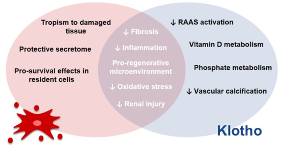 Additionally, Miao, J., et al., 2021 illustrated in mice a reverse in both mitochondrial loss of mass and the production of reactive oxidative stress with Klotho administration. Correspondingly, it is known that RAAS activation can lead to mitochondrial damage [99]. The inhibition of RAAS by Klotho, as shown in some prior studies [100], could protect mitochondrial function, contributing to the delay of age-fibrosis caused by RAAS. Although this effect has not yet been confirmed in the CKD context, this result suggests that it might be a possibility [99].