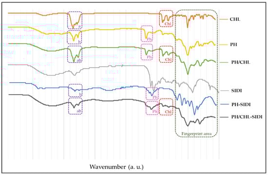 The FTIR spectra was recorded in the scanning range from 400 to 4000 cm−1, confirming the interactions among SIDI, lecithin (phosphatidylcholine), and cholesterol in the nano-phytosomes and nano-phytosomes incorporated by cholesterol. The interactions among lipid substrates and SIDI via suppressing a functional group at PH, PH/CHL, PH-SIDI, and PH/CHL-SIDI compared to SIDI, phosphatidylcholine, and cholesterol was proven (Figure 2).