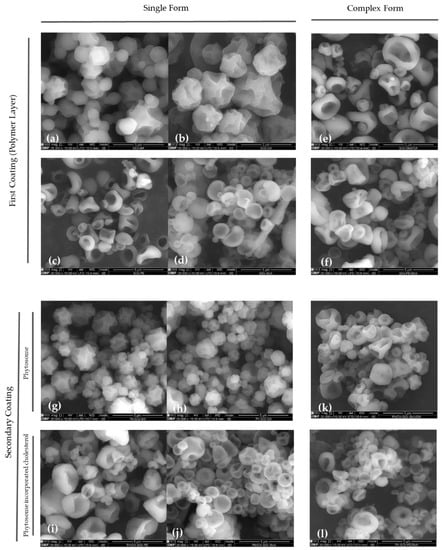 However, the product yield showed slight differences, when comparing the NP first coating and NP-secondary coating I and II. A slight increase in the production yield of some of the NP-secondary coatings II (2–15%) occurred, when compared to the single coating and NP-secondary coating I. Furthermore, no practical differences were observed for NP complexes on coating layers in all samples under study. In general, NP-secondary coating II presented slightly higher product yields compared to the other samples under study.