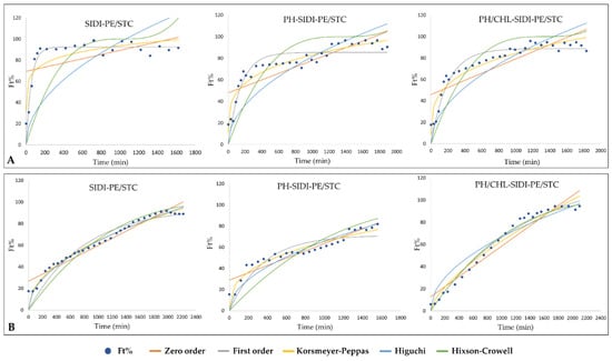 The in vitro release assays conceptualize the dissolution rate of a specific drug encapsulated in the formulated particles. Considering that the natural polymers’ layers used in this study have good solubility at neutral pH, a higher number of samples with a good fitting of drug release models at pH 7.8 was confirmed. The obtained results allow us to hypothesize that the drug release profile from the particles was pH dependent, and that the coating layers in this work allowed a sustained and controlled drug release at pH 7.8.