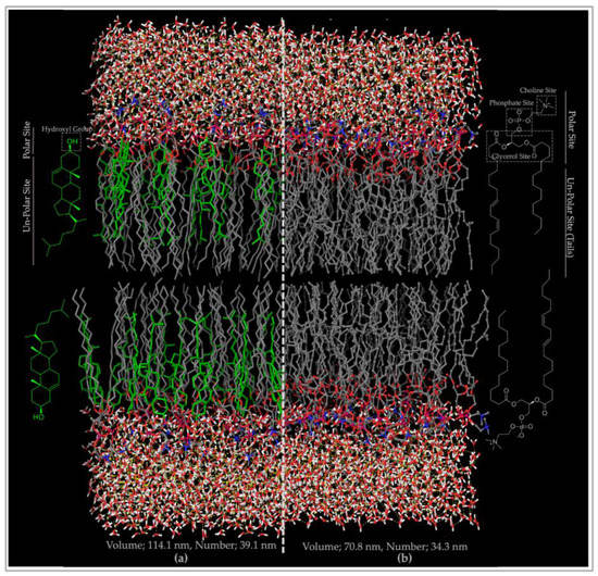 The 3D structures of phosphatidylcholine (≥ 94% of lecithin), cholesterol, and the two main phytochemicals of SI—caffeine and 5-caffeoylquinic acid (chlorogenic acid)—were downloaded from the ChemSpider database. They were prepared and refined using the Ligprep application (Maestro 12.8, Schrödinger, New York, NY, USA). The 3D models of nano-phytosome and cholesterol-incorporated nano-phytosome bilayers were generated using a MemGen web server defined for lipid membrane simulation systems []. The generated models were downloaded in PDB format and subjected to additional optimization using the OPLS3 force field using Maestro 12.8. To investigate the interaction of the phytochemicals with the related bilayers, a grid box (x = 8.96, y = 28.10, z = 30.36, Size of 40, 40, 40 Å) was created by grid generation. The interaction between ligands and bilayers was carried out using a glide application with extra precision (XP) level in Maestro 12.8. For each ligand, five poses have been used to evaluate docking interactions.