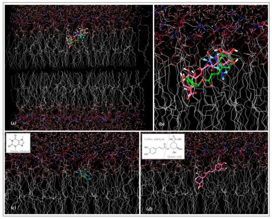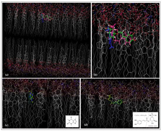 The interaction between nitrogen and the choline site of phospholipids was confirmed previously by molecular dynamics simulation (MD) regarding the peroxynitrous acid (ONOOH) and phospholipid bilayers []. Therefore, the higher docking score suggests the weaker hydrogen binding of caffeine (Table 7). This behavior may be due to its small size, not allowing a good incorporation in the lipid bilayer. However, based on the 3D model (Figure 5 and Figure 6), caffeine was adjusted on the polar site of phosphatidylcholine, just like the chlorogenic acid, but with a low docking score. Phenolics arrangement within a lipid bilayer was reported, recently, for the first time []. Based on information reported by Pruchnik et al. [] and Cordeiro et al. [] (already discussed in the current section) and the results obtained in this study regarding the in silico molecular arrangement, the interaction between active phytoconstituents/drugs with biological cell membranes could be properly predicted by molecular docking and molecular dynamic simulations.