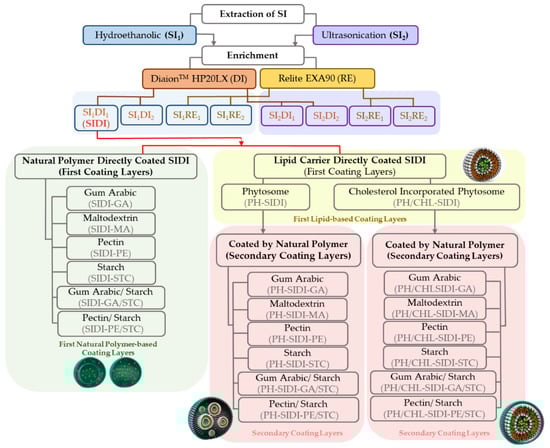 The most enriched fraction (SI1DI1) was then selected for the following formulation procedures. SI1DI1 (from now on named SIDI) was loaded into nano-phytosomes or cholesterol-incorporated nano-phytosomes as first coating layers (Chart 1, in yellow). In parallel, SIDI was also directly coated with NP as the first coating layer (single coating layer) (Chart 1, in green). Meanwhile, to improve the stability and protection of lipid-based carriers, NPs were also used to prepare secondary layers, encapsulating the abovementioned nano-phytosomes and cholesterol-incorporated nano-phytosomes (Chart 1, in pink). In sum, two types of the first coating layers were prepared, namely NP-based and lipid-based. In addition, these lipid-based layers (nano-phytosomes and cholesterol-incorporated nano-phytosomes) were also coated with different NPs as the secondary layer.