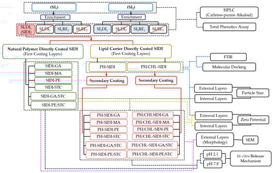 Flow of the preparation steps, regarding the type of extraction, enrichment, and type of coating layer (first or secondary layers). SI, silverskin; DI, Diaion resin; RE, Relite resin; GA, gum Arabic; MA, maltodextrin; PE, pectin; STC, starch; PH, nano-phytosome; PH/CHL, cholesterol incorporated nano-phytosome. Note: DI1 and RE1 series are the enriched fractions (regarding caffeine and phenolics contents) obtained with DI and RE, respectively. DI2 and RE2 series are the discarded fractions (rich in sugars, chlorophylls, etc.).