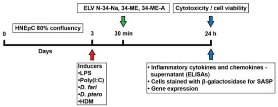 Experimental design. Human nasal epithelial cells (HNEpC) in primary culture challenged by allergy inducers—LPS, poly (I:C), D. fari, D. ptero, or a combination of house dust mite extracts (HDM) (D. farinae + D. pteronyssinus) (30 µg/mL) were analyzed to determine the protective effect of elovanoids (ELV)—ELVN-34-Na, 34-ME, or 34-ME-A (500 nM).