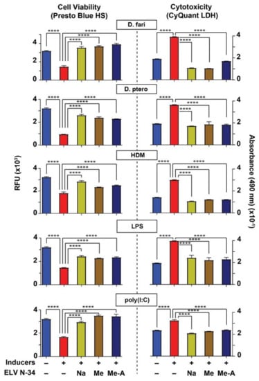 D. farinae, D. pteronyssinus, and HDM induced a decrease in cell viability (Figure 2, red bars at left panel) and increased LDH levels (Figure 2, red bars at right panel), indicating that HNEpC were subjected to cellular stress that compromises their viability. Cell viability assay using Presto Blue HS reagent also shows more resazurin to resorufin production in untreated cells or cells challenged with the inducers (Figure 2, left panel) and treated with ELVN-34.