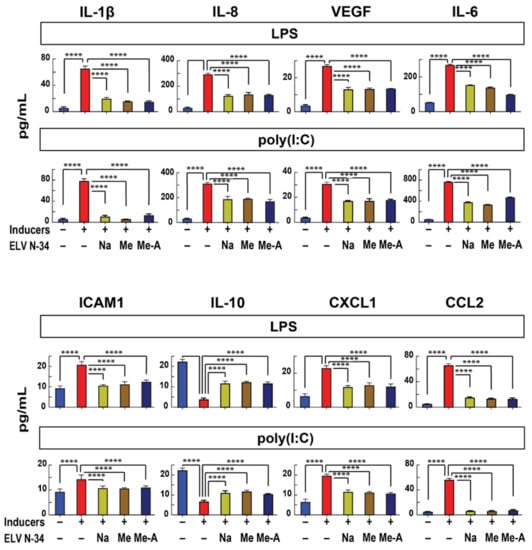HNEpC were exposed 30 min to LPS, or poly(I:C) or HDM (30 μg/mL), and their supernatants were collected in order to determine the expression of pro-inflammatory cytokines and chemokines IL-6, IL-1β, IL-8/CXCL8, CCL2/MCP-1, CXCL1/KC/GRO, VEGF, and cell adhesion molecule ICAM1(CD54). Our results demonstrate that the challenge of HNEpC with LPS or poly(I:C) induces the expression of pro-inflammatory cytokines and chemokines IL-6, IL-1β, IL-8/CXCL8, CCL2/MCP-1, CXCL1/KC/GRO, VEGF, and ICAM1(CD54) (Figure 3, red bars). The treatment of HNEpC with ELVN-34 (500 nM) reduces the expression of pro-inflammatory cytokines and chemokines (Figure 3). However, the allergy inducers—LPS and poly(I:C)—downregulate the expression of anti-inflammatory IL-10 in HNEpC that is restored to normal levels after treatment with ELVN-34 (Figure 3, panel IL-10). These results show that treatment with ELV protects HNEpC from the expression of pro-inflammatory cytokines under the stressors LPS and poly(I:C), favoring the expression of anti-inflammatory cytokines such as IL-10.