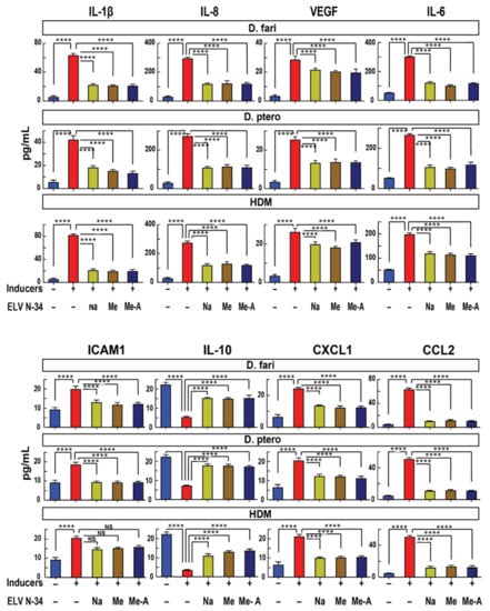 In an experimental model of retinal cells, ELV display protection against neurodegenerative diseases resembling age-related macular degeneration and Alzheimer’s disease, promoting repair, remodeling, and regeneration []. ELVN-34 promoted cell viability and decreasing cytotoxicity after HNEpC sensitization to HDM. Furthermore, our results indicate that the levels of IL-6, IL-1β, IL-8, VEGF, ICAM1, CXCL1, and CCL2, which had increased with HDM sensitization, were significantly reduced with ELVN-34 treatment. Likewise, the level of IL-10 was restored by treatment with ELVN-34. Therefore, ELVN-34 manages to decrease the production of pro-inflammatory cytokines, increasing the production of anti-inflammatory cytokines and decreasing the expression of adhesion molecules and vascular endothelial growth factor after exposure to inflammatory inducers and the HDM allergen.