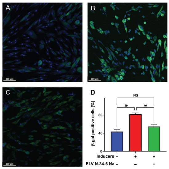 ELVN-34 protect HNEpC from the senescence-associated secretory phenotype (SASP response). Representative images of HNEpC stained with Hoechst 33342 and spider β-galactosidase—(A) untreated (control), (B) challenged with HDM (30 μg/mL), and (C) HNEpC treated with HDM and ELVN-34:6 Na (500 nM). (D) Quantitative assessment of increased SASP response (measured by the spider β-galactosidase staining) upon HDM exposure (30 μg/mL). ELVN-34:6 Na (500 nM) treatment reduces the number of beta-gal-positive HNEpC induced by HDM. The results showed the averages of three independent experiments. (* p < 0.05, NS—not significant).