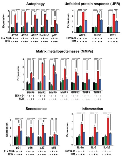 To search for the mechanism involved in ELV protection against HDM-mediated damage, UPR, MMP, senescence, and inflammation markers were analyzed by quantitative PCR on HNEpC challenged with D. farinae, D. pteronyssinus, and HDM (30 μg/mL). We selected genes involved in autophagy (ATG3, ATG5, ATG7, BECLIN-1, and P62) and UPR pathways (ATF6, CHOP, and IRE1) involved in endoplasmic reticulum (ER) stress, and MMP genes (MMP8, MMP2, MMP9, MMP3, MMP12, TIMP1, and TIMP2) as well as the expression of senescence (P21, P16, P27, and P53) and inflammation genes (IL-1α, IL-6, and IL-1β) (Figure 6). All the markers analyzed showed high expression in HNEpC after HDM sensitization, with the exception of p53 (Figure 6, red bars). The treatment of HNEpC with ELVN-34 (500 nM) significantly reduces the expression of all genes mentioned above after challenge with HDM (Figure 6, blue bars). Moreover, when HNEpC were treated with ELVN-34 only (without HDM stimulus), there were no significant changes in expression of these genes (Figure 6, green bars) in comparison to untreated cells (baseline levels) (Figure 6, black bars).