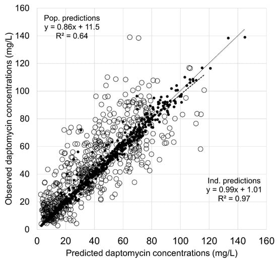 Observed versus model-based predicted concentrations of daptomycin in the learning dataset. Open circles and dashed lines, population predictions; black dots and dotted lines, individual predictions. Abbreviations: Ind., individual; Pop., population.
