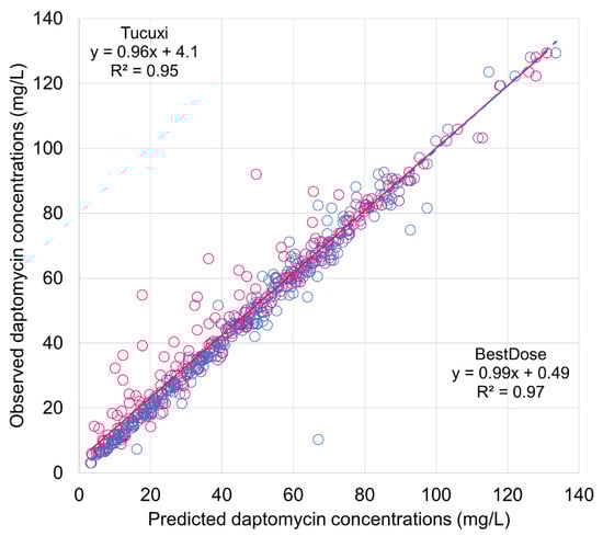 Observed plasma concentrations of daptomycin versus individual predictions from BestDose and Tucuxi in the validation dataset. Blue circles and dashed lines, BestDose predictions; red circles and solid line, Tucuxi predictions.