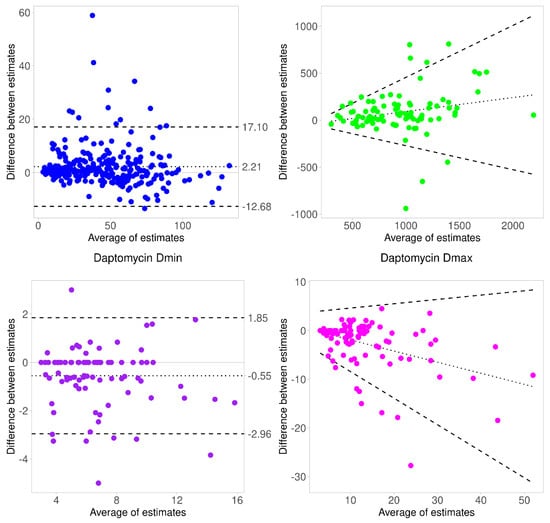 In addition, we assessed the concordance between predicted concentrations, AUC24h, Dmin and Dmax by performing a Bland–Altman analysis []. For each pair of predicted concentrations, AUC24h, Dmin and Dmax provided by BestDose and Tucuxi, we plotted the difference (BestDose estimate minus Tucuxi estimate) versus the average value. We used the BA-plotteR webtool to build the scatterplots and derive the mean difference line and limits of agreement []. Regression-based limits of agreement were used for the plot of AUC24h and Dmax because the slope of the regression line was significantly different from zero, suggesting a proportional bias.