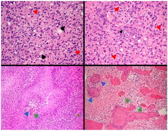 Glioblastoma with a poor prognosis based on its immunohistochemistry panel. Paraffin sections show fragments of a densely hypercellular glial tumor. The tumor is composed predominantly of moderately pleomorphic fibrillary astrocytes arranged in diffuse sheets. A small component of gemistocytic cells is noted (black arrows). There are moderate numbers of mitotic figures (red arrows). Foci of microvascular proliferation with multilayering of atypical cells around vessel lumena are also noted. Prominent pallisading and confluent necrosis is noted (blue arrows). Several of the latter areas incorporate thin-walled necrotic blood vessels (green arrows). The features are of glioblastoma multiforme (WHO Grade IV). GFAP: positive; Nestin; positive (high); IDH-1; R132H: negative (not mutated); ATRX: positive (not mutated); MGMT: negative (likely methylated); p53: positive p16; CDKN2A: negative; Topoisomerase labeling index: Approximately 35%. Case courtesy of RMH Neuropathology, Radiopaedia.org, rID 41309, modified.