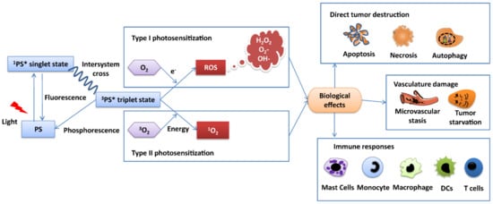 Initially, PDT was commonly used to treat nonmalignant diseases (acne and age-related macular degeneration) [8,9,10]. Since the mid-1950s, PDT has been explored as a treatment option in a large variety of preclinical cancer models; when increased specificity and selectivity was achieved in the early 1990s, clinically approval was obtained for cancer treatment [11]. For example, PDT is used to target lung tumors, esophageal cancer, gastric carcinoma, breast cancer, brain tumors, head and neck tumors, colorectal cancers, etc. [12]. PDT is a multistage process, based on three components: a photosensitizer (PS), a light source, and tumor oxygen. It exerts its tumor destruction effects through photochemical and photobiological mechanisms [13] (Figure 1). The PS has negligible cellular toxicity under a lack of light, regardless of the route of administration. An appropriate light dose can provide enough energy for the accumulated PS in the diseased tissue to move into an excited state from the ground state, leading to the production of free radicals and ROS. Depending on the nature of this reaction, such photosensitized processes are defined as Type I and Type II. During the Type I process, triplet excited PS directly interacts with the cell substate to generate free radicals (e.g., hydroxyl radicals, superoxide anion, and hydrogen peroxide) through a hydrogen atom (electron) transfer. These radicals can further interact with oxygen to produce toxic reactive oxygen species. A Type II process, however, produces highly reactive singlet oxygen (1O2) via oxygen (3O2) through electron transfer. These reactive species are highly cytotoxic and directly kill tumor cells by inducing apoptosis, necrosis, or autophagy [14]. However, the kind of cell death induced by the PDT treatment depends on the characteristics of the PS (e.g., intracellular location and activation wavelength), cell type, and PDT dose (including PS concentration and total light fluence) [15]. Moreover, the destruction of tumor cell results in the production of new tumor-derived antigens and the increased expression of stress proteins. These PDT-killed tumor pieces are phagocytosed by macrophages and lead to acute inflammation, leukocyte infiltration, and maturation activation of dendritic cells [6]. PDT also reduces tumor volume indirectly by inducing microvascular shutdown and vessel leakage. This event can lead to nutrient starvation and hypoxia [16]. In general, the function of these mechanisms is cooperative, but which particular mechanism is dominant in PDT’s tumor-controlling effects is still unclear and requires further study.