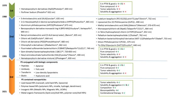 Different generations of PSs widely used in various cancer cell types. Currently developed PSs can be divided into first-generation PSs, second-generation PSs, and third-generation PSs. The description is provided as follows: ● chemical name (abbreviation)(trade name is indicated with®, and excitation wavelength is indicated in “nm“ during clinical PDT procedure). If information is not available, this is indicated with (-). λ in PTW represents the typical wavelength at which absorption of photosensitizer occurs to penetrate into tissues (PTW, λ > 600 nm), and ε represents the absorption rate at PTW.