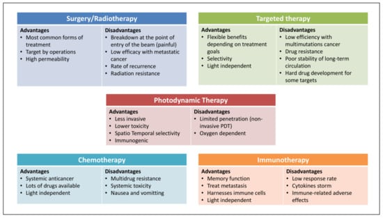 Summary of the advantages and disadvantages of major cancer therapies. PDT-based combination therapies for the treatment of cancer integrate the advantages and bypass the disadvantages of monotherapies, including surgery, radiotherapy, targeted therapy, immunotherapy, and other combined strategies.