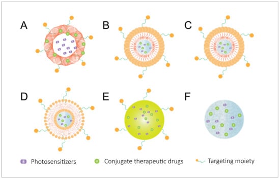 Most used codelivery systems for combined therapies with PDT in cancer, including (A) polymeric nanoparticles (PNPs), (B) nanostructured lipid carriers (NLCs), (C) solid lipid nanoparticles (SLNs), (D) liposomes, (E) gold nanoparticles (AuNPs), and (F) hydrogels.