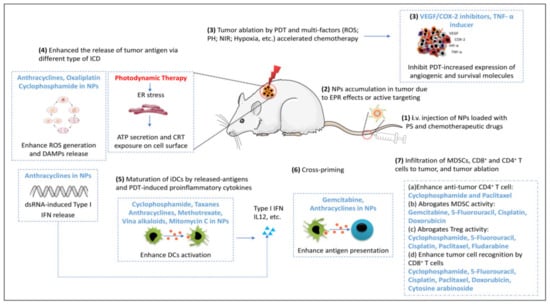 The mechanisms of NP-mediated chemo-photodynamic therapy enhance monotherapy indices and synergistically trigger robust antitumor immune responses for anti-primary and metastatic tumors: (1) intravenous injection of PSs and chemotherapeutic agents loaded with nanoparticles; (2) enhanced NP accumulation in tumor due to the tumor-targeting capability of NPs (EPR effects and targeting motif modification on NP surface); (3) primary tumor ablation by enhanced PDT and chemotherapy. PDT-caused vasculature rupture induced surviving tumor cells to produce more protumor factors in the tumor microenvironment. Antiangiogenetic mediators, such as VEGF and COX-2 inhibitors, help PDT to achieve more powerful tumor destruction and a lower recurrence or metastasis rate, by blocking tumor angiogenetic activity molecules or their receptors; (4) PDT and chemotherapy (anthracyclines, cyclophosphamide, and oxaliplatin) of the primary tumor to induce higher ICD levels and the release of tumor-associated antigens. Anthracyclines also induce dsRNA release from dead tumor cells, which can activate tumor-specific CD8+ T cells by binding to Toll-like receptor-3 and inducing type I interferon production; (5) DC maturation and antigen presentation are enhanced by PDT-generated antigens, proinflammatory cytokines, and chemotherapeutic agents; (6) cross-priming in tumor lymph node; (7) Chemotherapeutic agents in NPs can improve PDT-induced immune responses by modulating the activity of immune cell subsets and by promoting tumor cell death.