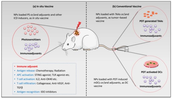 - Cai, Z.; Xin, F.; Wei, Z.; Wu, M.; Lin, X.; Du, X.; Chen, G.; Zhang, D.; Zhang, Z.; Liu, X.; et al. Photodynamic Therapy Combined with Antihypoxic Signaling and CpG Adjuvant as an In Situ Tumor Vaccine Based on Metal-Organic Framework Nanoparticles to Boost Cancer Immunotherapy. Adv. Healthc. Mater. 2020, 9, e1900996. [Google Scholar] [CrossRef] [PubMed]