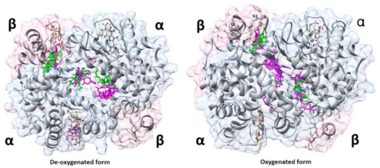 In silico molecular docking poses of gemcitabine on hemoglobin S tetramer in deoxygenated (left) and oxygenated (right) forms. In the deoxygenated form (left), the green poses are poses with binding energy of −6.0 to −6.4 kcal/mol and the pink poses are those with binding energies of −5.7 to −5.9 kcal/mol. In the oxygenated form (right), the green poses are poses with binding energy of −6.5 to −6.9 kcal/mol and the pink poses are those with binding energies of −6.0 to −6.4 kcal/mol. The best poses in both forms are those between the α and β chains. Figures were prepared with UCSF Chimera [16].