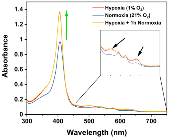 UV-vis absorption spectra of HbS protein after overnight treatment under hypoxia (1% oxygen), normoxia (21% oxygen), and after exposing the hypoxia samples to 21% oxygen (normoxia condition) at 37 °C for 1 h.