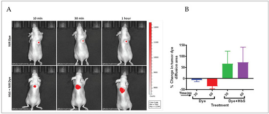 The tumors treated with HbS trended toward having a more ubiquitous distribution of dye throughout the tumor after injection at 10 min, 30 min, and 1 h. This supports the notion that HbS polymerization disrupts the tumor microenvironment and can improve diffusion of small molecules throughout the tumor (Figure 3).