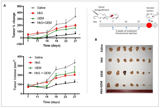 In vivo antitumor efficacy of GEM and HbS combination. Tumor-growth inhibition in mice treated with saline, HbS, GEM, and HbS + GEM by intratumoral injection (n = 7). Tumor percentage change and tumor volume (A). Data given as mean ± standard deviation (n = 7). (B) Photograph of tumors for the four groups of saline, HbS, GEM, and HbS + GEM. * p < 0.05; Abbreviations: GEM, gemcitabine; HbS, hemoglobin S.