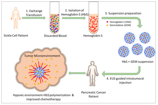 Theoretical overview of hypoxia-induced polymerization of HbS and synergistic chemotherapy. (1.) Blood could be harvested during exchange transfusion from a patient with known sickle cell anemia or HbS could be engineered in a lab. (2.) HbS could be isolated and pooled together. (3.) HbS and GEM can be complexed in solution. (4.) An endoscopic ultrasound (EUS) injection can deliver therapy directly to the tumor. Once in the tumor microenvironment, HbS polymerizes and allows improved diffusion of GEM throughout the tumor.
