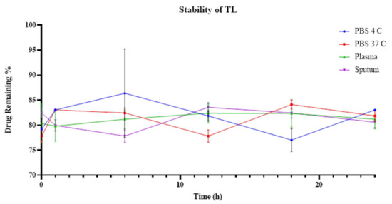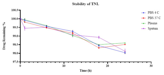 The TNL formulation was highly stable, and time seemed to have little or no effect on the drug release of the liposomes (Figure 2). The TL formulation had a lower stability than our TNL, but maintained a sustained drug release over the 24 h (Figure 3). Of the tested environments, plasma had a constant drug release starting at 79% at hour 1, and 80.7% at hour 24. The same phenomenon was observed with sputum, except for a slight decrease at hour 6 (77.8%). Regarding the stability of TL in PBS at 37 °C and 4 °C, the released drug varied. The highest retention percentage for TL at PBC 4 °C was 81.8% at hour 24, and the lowest was 77.1% at hour 18. For the PBS incubated at 37 °C, the highest retention percentage was 84.18% at hour 18, and the lowest was 77.8% at hour 12. No significant differences were detected in the stability of all the tested conditions for both TL and TNL formulations (p value > 0.05).