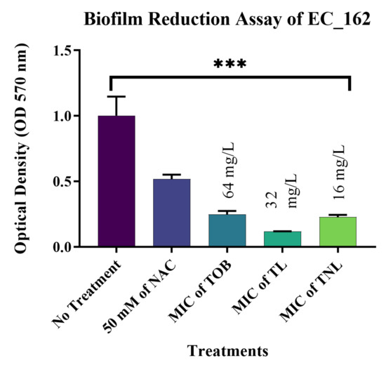 Biofilm reduction assay for isolate EC_162. (p value = 0.0003, *** highly significant; error bars reflect the standard error of the mean (SEM)).
