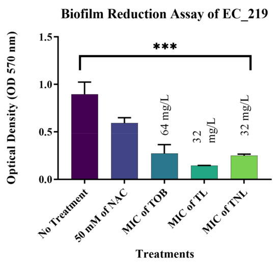 Biofilm reduction assay for isolate EC_219. (p value = 0.0008, *** highly significant; error bars reflect the SEM).