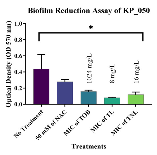 Biofilm reduction assay of isolate KP_050. (p value = 0.0343, * significant; error bars reflect the SEM).