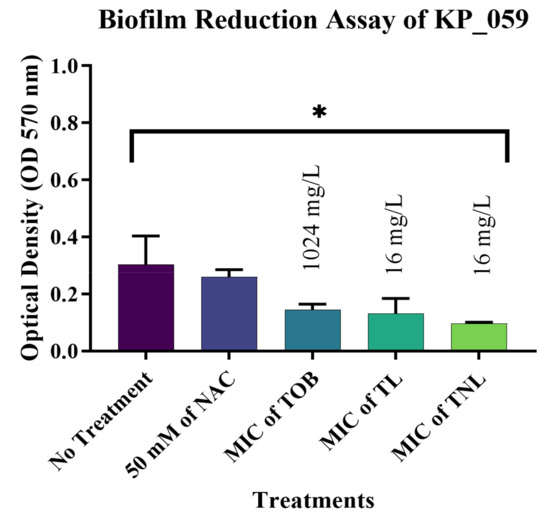 Biofilm reduction assay of isolate KP_059. (p value = 0.0411, * significant; error bars reflect the SEM).