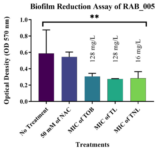 Biofilm reduction assay of isolate RAB_005. (p value = 0.0027, ** very significant; error bars reflect the SEM).