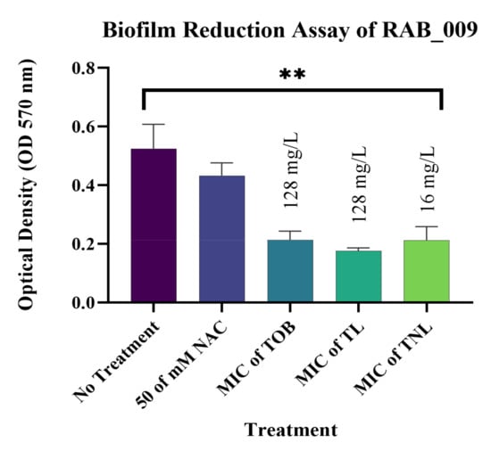 Biofilm reduction assay od isolate RAB_009. (p value = 0.0027, ** very significant; error bars reflect the SEM).