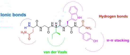 The balance between hydrophilicity and hydrophobicity can positively contribute to adequate gelation properties. The pentapeptide consists of two hydrophilic amino acids (N: Asn, G: Gly) at the N-terminal site and three hydrophobic amino acids at the C-terminal site, forming a small amphiphile. The backbone over-satisfies the criteria for gelling [10]. Naturally occurring aromatic amino acids Phe, Tyr, Trp, and even His form well-ordered nanostructures like fibrils, ribbons, or rods [23]. Two aromatic amino acids, tryptophan and tyrosine, are incorporated into the sequence and involved in intra- and intermolecular interactions due to the π-π stacking of the aromatic rings of the side chains. The backbone conformation of the peptide sequence is also responsible for its molecular self-assembly and mechanical stiffness. Glycine is among the amino acids that usually participate in the nanofiber’s formation. Isoleucine, an aliphatic amino acid, favors van der Waals forces and asparagine due to the side-chain carboxamide group inducing hydrogen bonds completing the most important interactions in peptide self-assembly. Hydrogen-bond formation, determining the secondary structure of the peptides, is also assisted by the C-terminal carboxamide. The peptide has a positive net charge of +1 due to the free amino group at the N-terminal site. The synergism and cooperativeness of all these weak interactions lead to a dynamic and responsive interplay around the peptide structure, leading to a functional material when it is exposed in an aqueous environment.