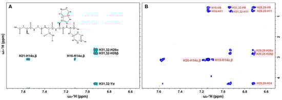 A 1H–1H NOESY (nuclear Overhauser effect spectroscopy) spectrum was recorded for the NGIWY peptide in the soluble form at a concentration of 1.3 × 10−3 M. The NOESY spectrum showed several well-resolved weak positive NOEs (cross-peaks with opposite sign with respect to the diagonal), as expected for a low-molecular-weight molecule (Figure 3). The intermolecular interactions responsible for the formation of the hydrogel network were then investigated and in the 2D NOESY spectrum of the hydrogel, strong negative NOE enhancements appeared. This effect is characteristic for large-molecular-weight molecules that transfer magnetization efficiently through dipolar interactions. Due to fast dynamics of exchange between solution and gel states in the NMR frequency time scale, information was transferred from the hydrogel fibers to the molecules in solution, resulting in strong negative NOEs on the 2D map [26]. Interestingly, several new NOEs appeared in the spectrum of the hydrogel, including cross-peaks between the methyl protons 9 and 11 of Ile and all the aromatic protons of (i) Tyr (H28, H29, H31 and H32) and (ii) H16 of Trp, suggesting a possible folding of the two aromatic regions of Tyr and Trp resulting in a closer proximity to Ile. In addition, protons H9 showed new NOEs with proton H10β of Ile and the aromatic protons H28 and H29 of Tyr with H26α, H26β, and H24 protons of the same residue. Protons H19 and H20 demonstrated weak negative NOEs with proton H14α,β of Trp, indicating spatial proximity. Additionally, the NOEs between protons H8 and H9 and protons H10α and H10β of Ile remained as weak positive NOEs, which was expected since they are attributed to a TOCSY effect and spin-spin diffusion occurs through bonds.