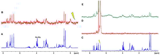 Further investigation of the exchange phenomena between the molecules in the solution state and the molecules incorporated into the hydrogel fiber network was performed with saturation transfer difference (STD) NMR experiments. STD NMR experiments are based on the nuclear Overhauser effect and on the magnetization transfer via spin diffusion from a selectively irradiated macromolecular receptor to the protons of a ligand that are in close contact with the receptor (≤5 Å) [27]. The applications of STD NMR spectroscopy in the study of supramolecular gels and amino acid-based hydrogels have been investigated very recently [26]. In this case, the hydrogel fibrous network can be considered the macromolecular receptor that is selectively saturated. The selective saturation of the hydrogel can be transferred through the nuclear Overhauser effect throughout the network, resulting in the bound gelator molecules, which are then dissociated back to the pools of water transferring the saturation in the isotropic solution phase. Only the STD signals of the gelator molecules that have been in contact with the hydrogel fibers and have received magnetization transfer will appear in the spectrum. We selectively saturated a region below 0 ppm where only resonances of the network were present and observed STD signals for all the amino acid gelator molecules that received saturation from the fibrous network. The STD signal of Gly H5 was significantly lower compared to the rest of the molecules, possibly indicating a strong binding with longer residence time in the hydrogel network resulting in lower magnetization transfer and less intense STD signals (Figure 4A,B) [25]. We then investigated the magnetization transfer occurring upon the selective irradiation of the H28 and H29 aromatic protons of Tyr residue (Figure 4C–E). In the case of the NGIWY peptide in solution (1.3 mM), except for the nearby H31, H32, H19, H16, and H20 protons, which are within the 0.5 ppm regime of irradiation specificity, no other STD signals appeared in the STD spectrum, suggesting that magnetization was not transferred to the rest of the protons (Figure 4D). On the other hand, when the Tyr aromatic protons H28 and H29 were selectively irradiated in the case of the hydrogel, the STD signals of all the amino acids appeared in the spectrum (Figure 4E). This could be explained by the fact that magnetization was transferred from the gelator molecules to the hydrogel network and from the fibers back to all the protons of the gelators. Again, the STD signal of Gly H5 was lower due to stronger binding.