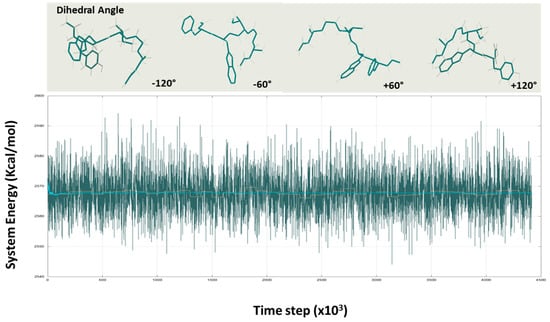 Because the interactions involved in turn formation are mostly local, turns have been argued to be significant in folding because they can commence productive structure creation without a large loss in chain entropy [28]. With the exception of the N- and C-termini, the torsion angles for amino acids suggest significant structural heterogeneity in the system. Our findings imply that the pentapeptide’s central Ile frequently adopted a type-II turn conformation (φ = −60°, φ = 120°) or an antiparallel sheet structure (φ = −120°, φ = 60°), (Figure 4). B-turns are well suited to participating in ligand binding, molecular recognition, protein–protein, or protein–nucleic acid interactions because they are largely surface-exposed, influencing protein activities and intermolecular interactions. Because the interactions involved in turn formation are mostly local, turns have been argued to be significant in folding because they can commence productive structure creation without a large loss in chain entropy [30].